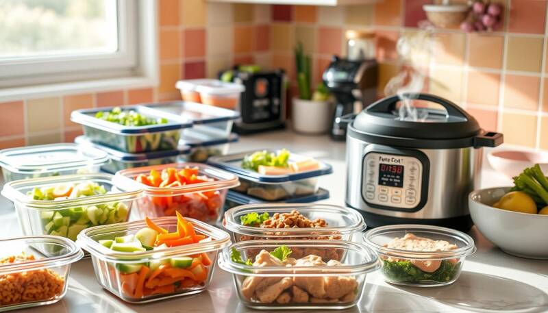 You need gadgets like slow cookers and instant pots. Good storage containers and apps are also key. They help you cook and plan better.